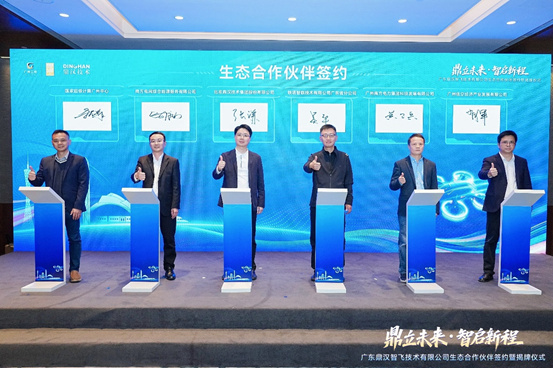 仪式现场,鼎汉技术及鼎汉智飞与南方电网综合能源股份有限公司、广东铁塔智联有限公司、广州南方电力集团科技发展有限公司、广州市低空经济产业有限公司、国家超级计算广州中心五大主体,就“AI+能源”全链条协同达成共识,推进联合行动计划。各方将在算力基建、能源运营服务、低空数字化管控等方向深化协作,构建开放共赢生态。