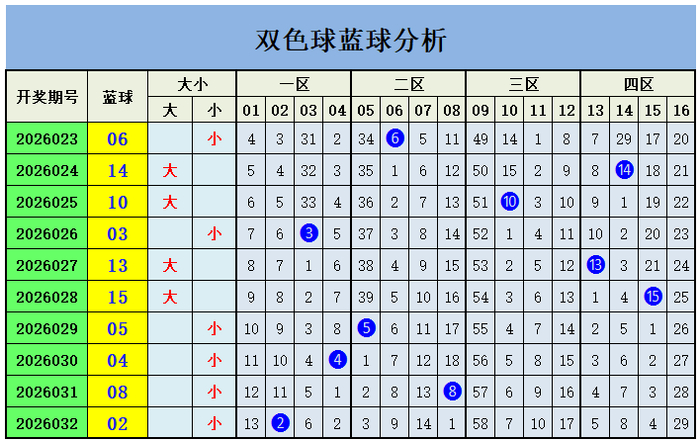 上期转头:双色球第2026032期开出奖号:红球01、03、11、18、31、33;蓝球02,其中红球三区比为3:1:2,开出3枚重号03、18、33,开出0组连号,蓝球开出一区号码02。