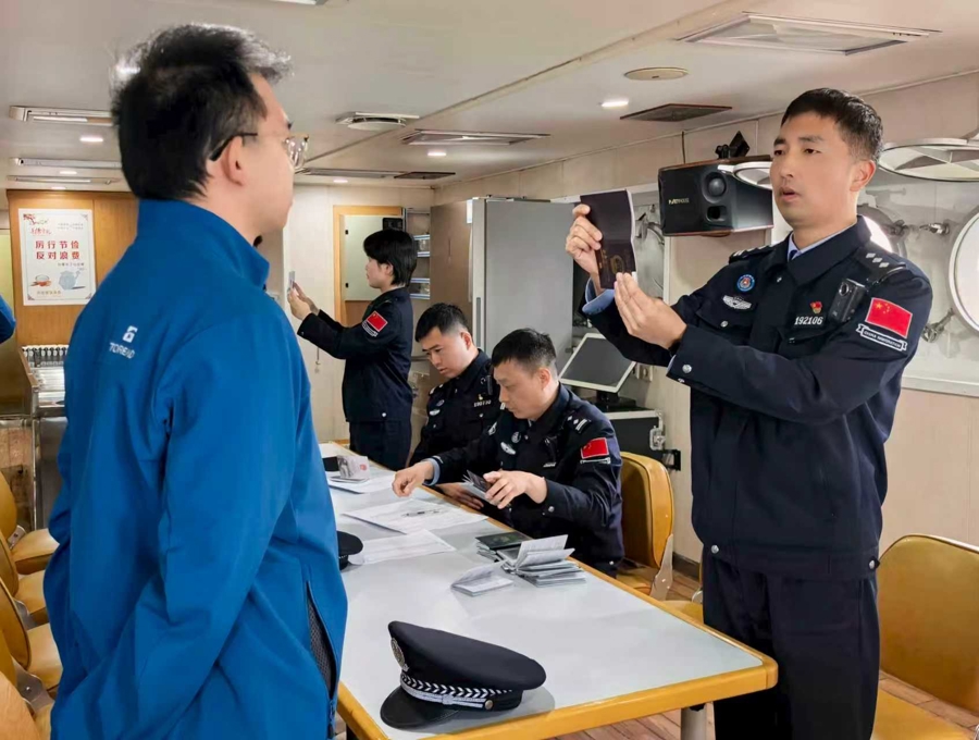 上海边检总站外高桥边检站实施全经过通关保险,护航“雪龙”号及东说念主员高效通关、顺利抵沪。外高桥边检站抽调警力成立专项勤务组,于当日朝晨提前到达船埠,先期开展信息梳理、通说念筹商、在港监护等通关搜检准备职责。“雪龙”号靠泊后,民警第一时辰登轮,在船上树立前置搜检点,为“雪龙”号100余名科考队员和船员高效办理了入境边检搜检手续。