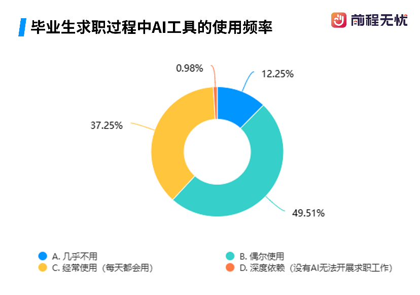 从使用频率来看,朝上86%的受访毕业生在春招过程中使用过生成式AI用具,其中37.25%默示“每天皆会使用”,另有近半数属于“偶尔使用”,仅有12.25%的毕业生简直不使用AI。这意味着,AI用具已从“加分项”改换为“基础竖立”,成为求职准备的艰苦构成部分。