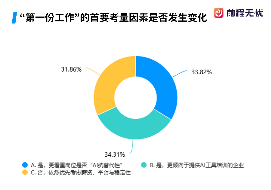 远景无忧的数据显现:在任业聘用法式上,约68%的受访毕业生默示其求职考量已发生变化。其中,三分之一受访毕业生更关注“岗亭的AI抗替代性”。这意味着,AI不仅改变了求职阵势,也在重塑奇迹价值判断。比拟传统的“薪资、平台、康健性”三身分,新一代毕业生开动将“技能适配才能”纳入中枢考量。