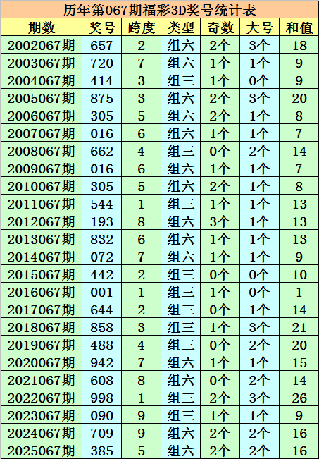 在以上奖号中奖,积年第067期福彩3D出现10次组三,出现14次组六。组三、组六比例抓平,本期堤防组六出现。