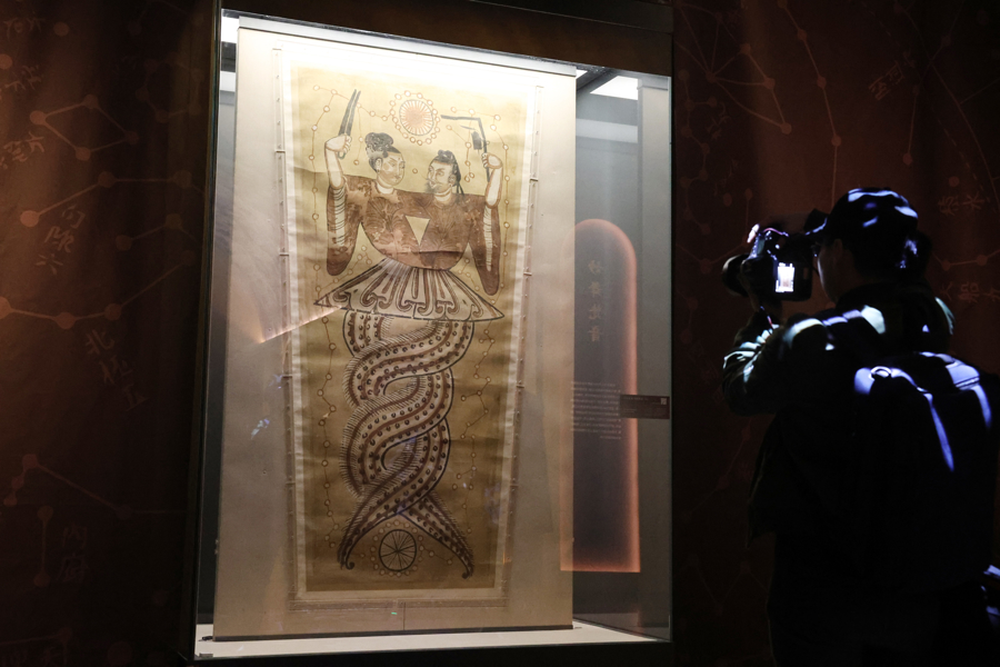 新疆维吾尔自治区博物馆的镇馆之宝——唐代伏羲女娲绢画。出土于吐鲁番阿斯塔那墓地,画中人首蛇身的伏羲与女娲相依交尾,执规执矩,周身环绕日月星辰。