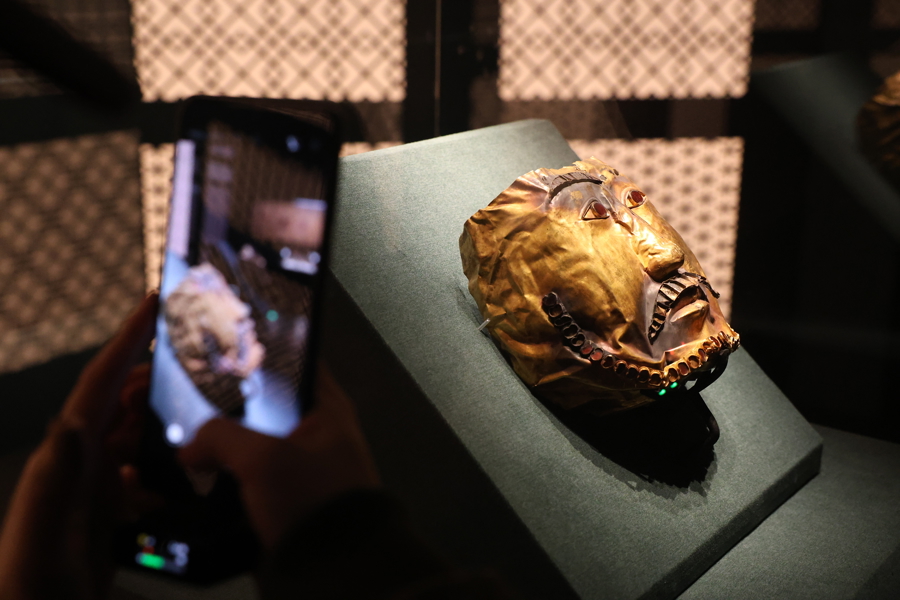 草原黄金面具——来自伊犁草原古墓的纯金面具,眼部和胡须位置原镶嵌有红宝石,是古代草原贵族权力与财富的象征。