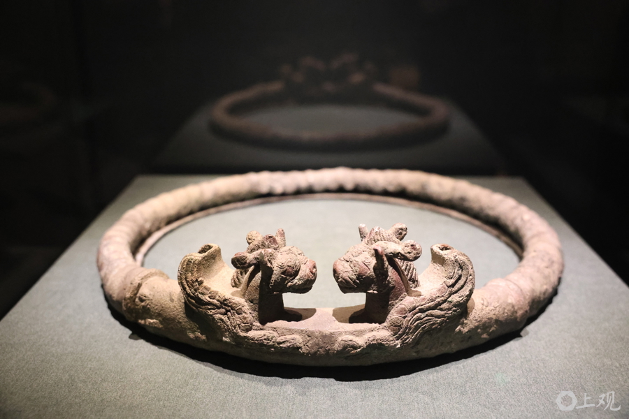 战国时期的翼兽对视铜环。环圈的前部是相对伏卧状高浮雕的有翼兽及前身部位,兽翼为弧形且上翘,表现了羽翼纹饰。这种翼兽风格具有典型的塞人艺术特征。