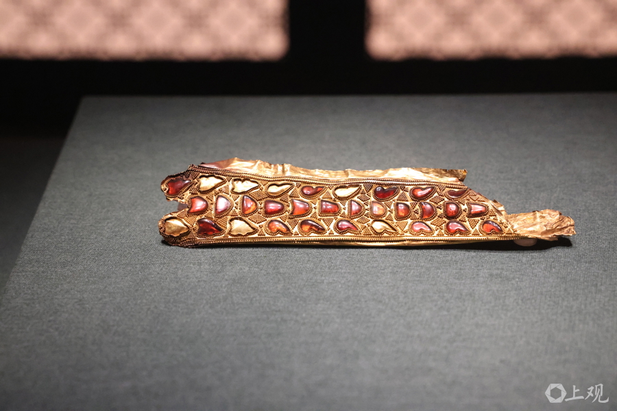 公元5-6世纪镶嵌红宝石金剑鞘,该剑鞘黄金质地,为短剑剑鞘外的包金部分。有纹饰的一面,沿鞘身边缘点焊两道金珠点饰,中间以细金珠点左右对称点焊出三列半月形、月牙形、心形、勾玉形宝石座,内嵌红宝石,装饰华丽,做工极为精细。