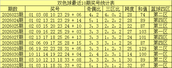 南华天第2026033期双色球区间号码个数统计分析:(红球:01-11为一区,12-22为二区,23-33为三区;蓝球:01-04为一区,05-08为二区,09-12为三区,13-16为四区)